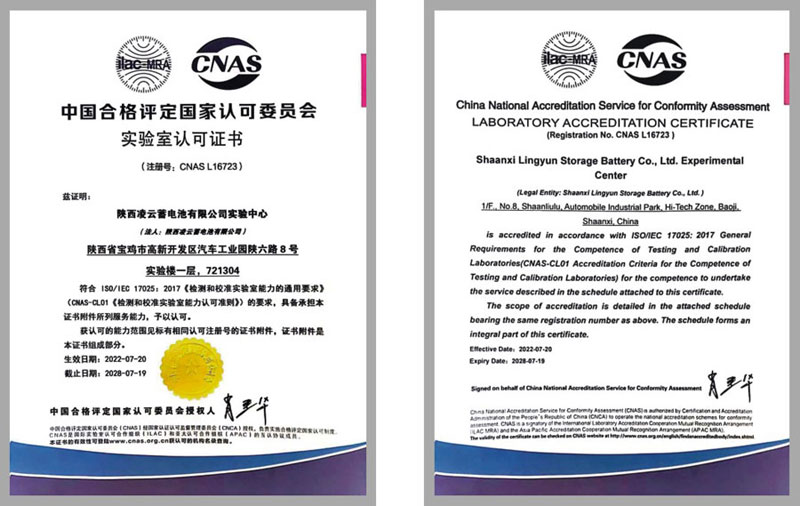 CNAS實驗室 陝西淩雲蓄電池有限公司實驗中心於(yú)2022年7月通過中國合格評定國家認可委員會(CNAS)實驗室認可,注冊(cè)号爲:CNAS L16723。檢測對象爲鉛酸蓄電池,技術能力覆蓋GB/T 5008.1-2023《起動用鉛酸蓄電池第1部分:技術條件和試驗方法》、GB/T 43346-2023《起停用鉛酸蓄電池技術條件》等檢測領域中20h率容量、低溫起動能力試驗、耐振動性試驗、循環耐久能力等54項檢測項目。 實驗中心現有人員11名,管理人員6名,檢測人員5名,其中高工1名,工程師7名,研究生學曆1名,本科學曆10名。近年來,實驗中心不斷購入現代化的質量檢測儀器設備(bèi),主要有直讀光譜分析儀、蓄電池性能測試系統、大電流測試儀、高低溫試驗箱、振動台等先進設備(bèi)。爲滿足客戶檢驗檢測需求提供瞭(le)儀器設備(bèi)保障。 實驗中心成功取得CNAS認可,充分體現出公司實驗中心良好的管理水平,表明公司檢驗能力和檢驗水平達(dá)到國(guó)際認可标準。